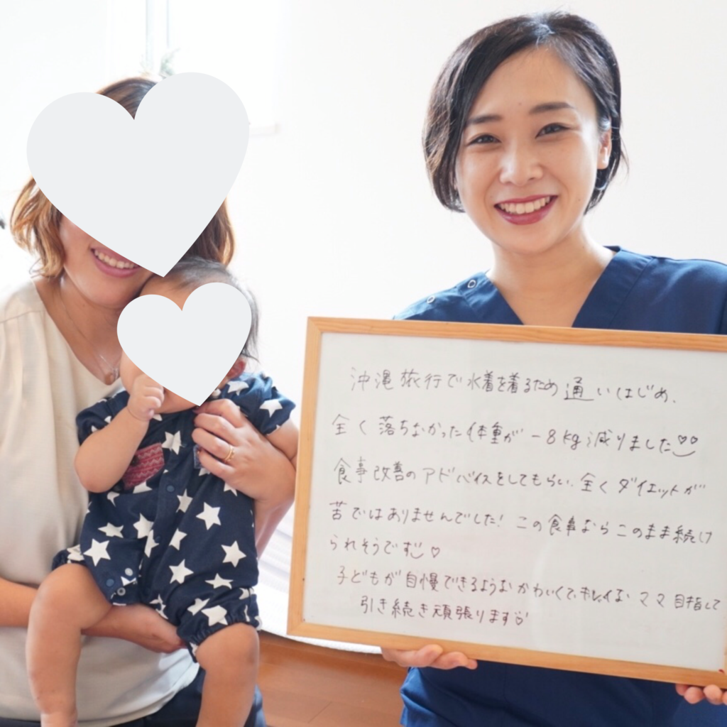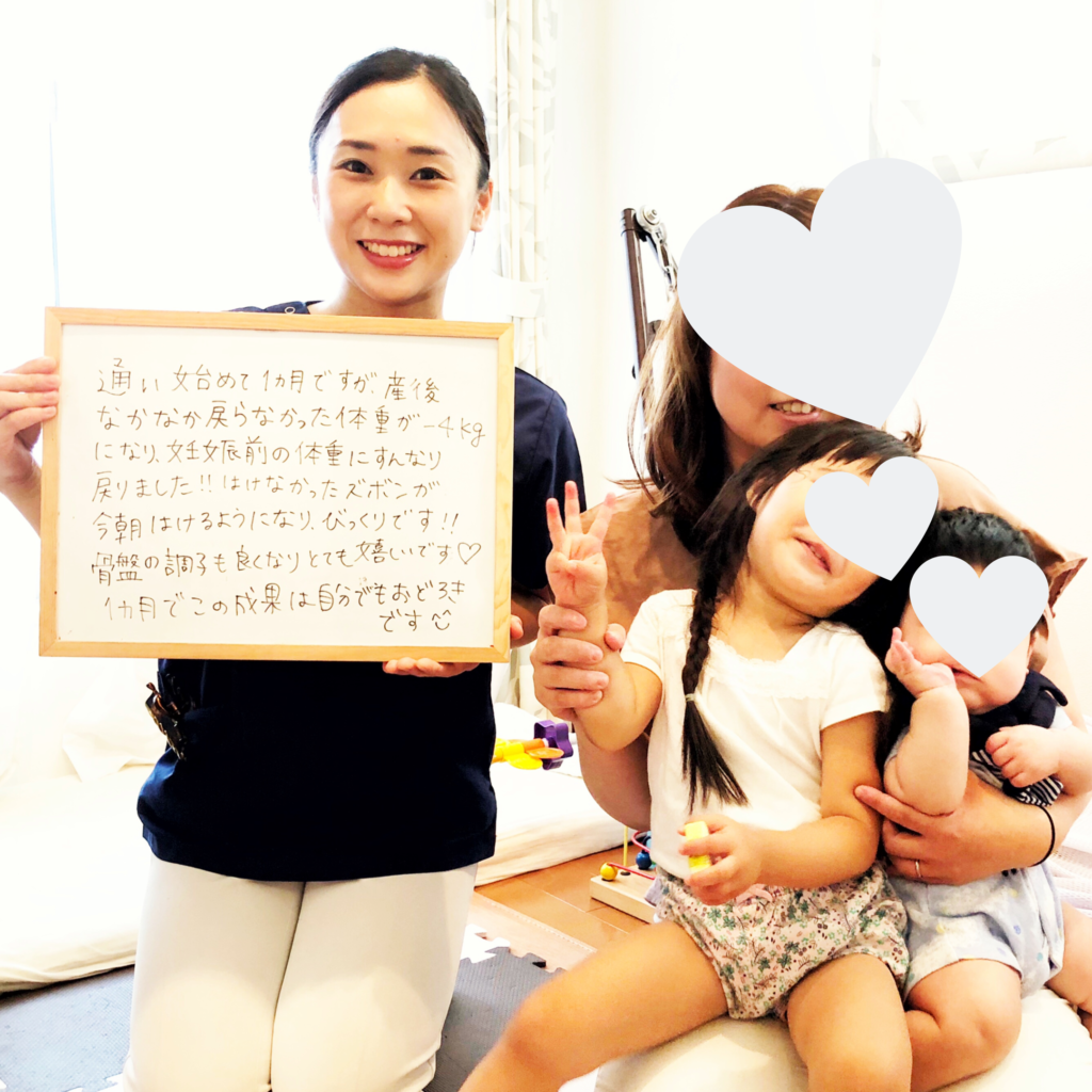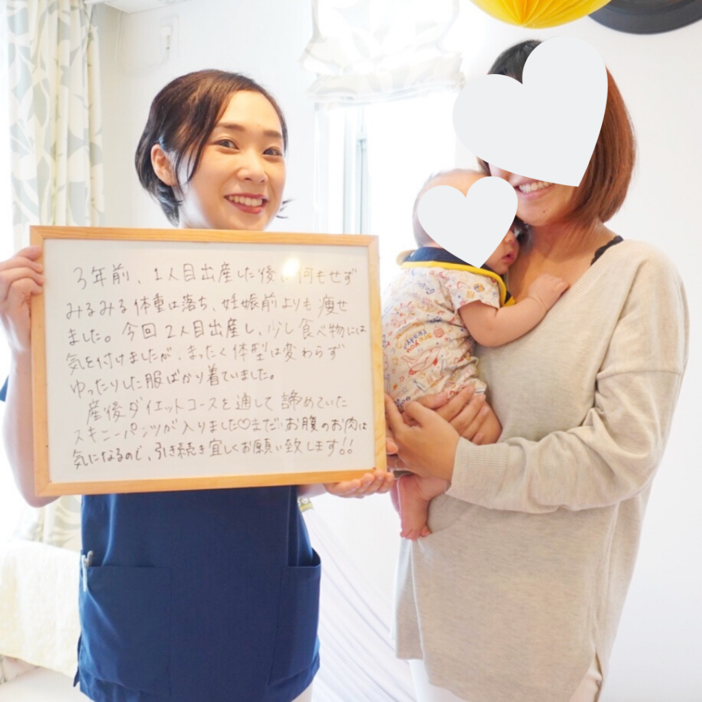 産後骨盤ダイエットコースを受けられたことで、「妊娠前の体重に戻った!」「妊娠前よりも細身のジーンズが履けるようになった!」等、効果を実感していただいています。詳しくはメニューページをご覧ください。