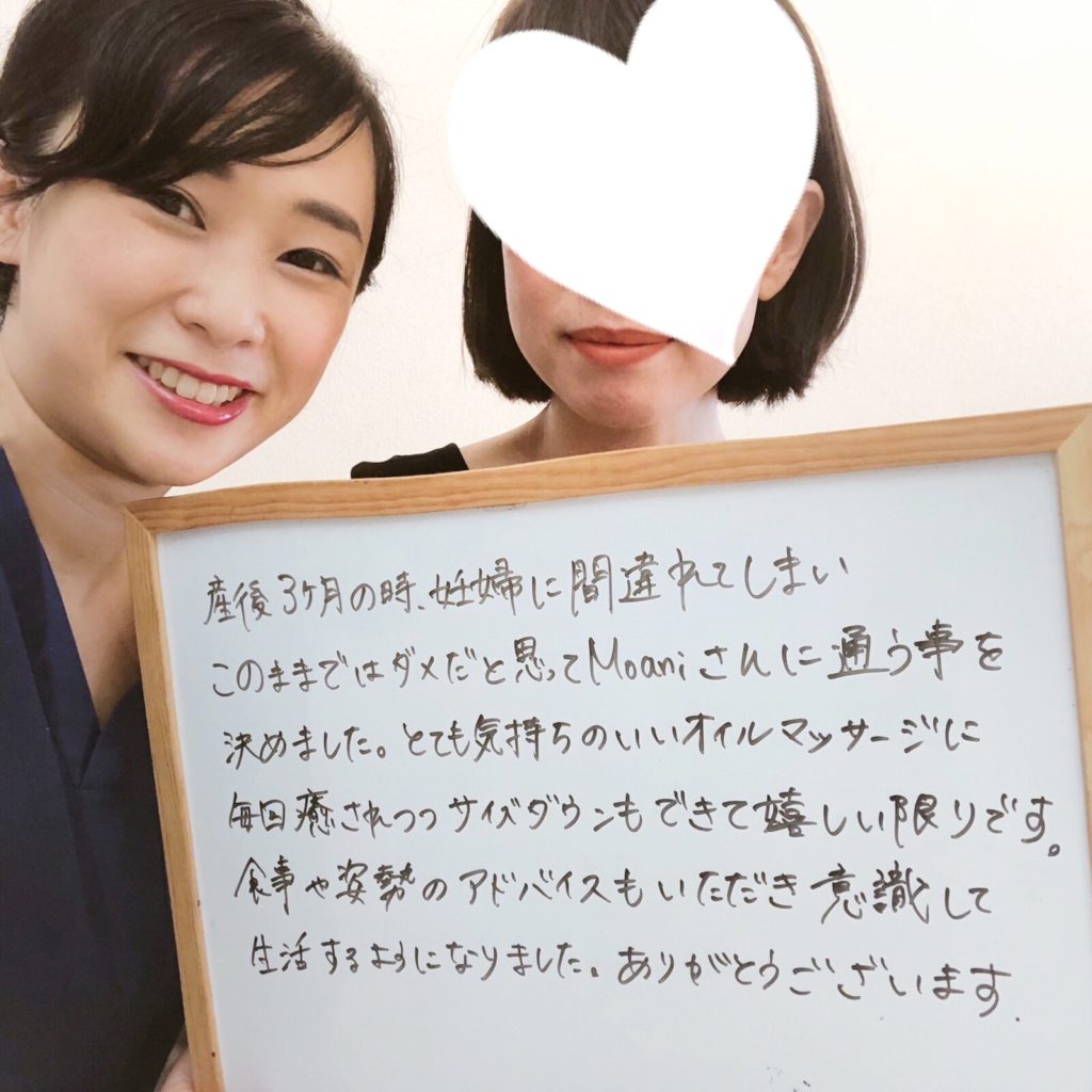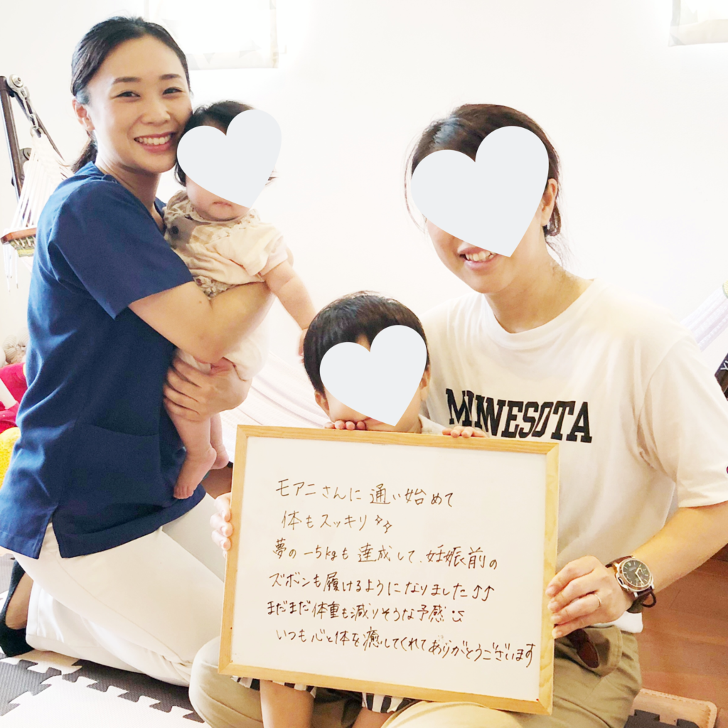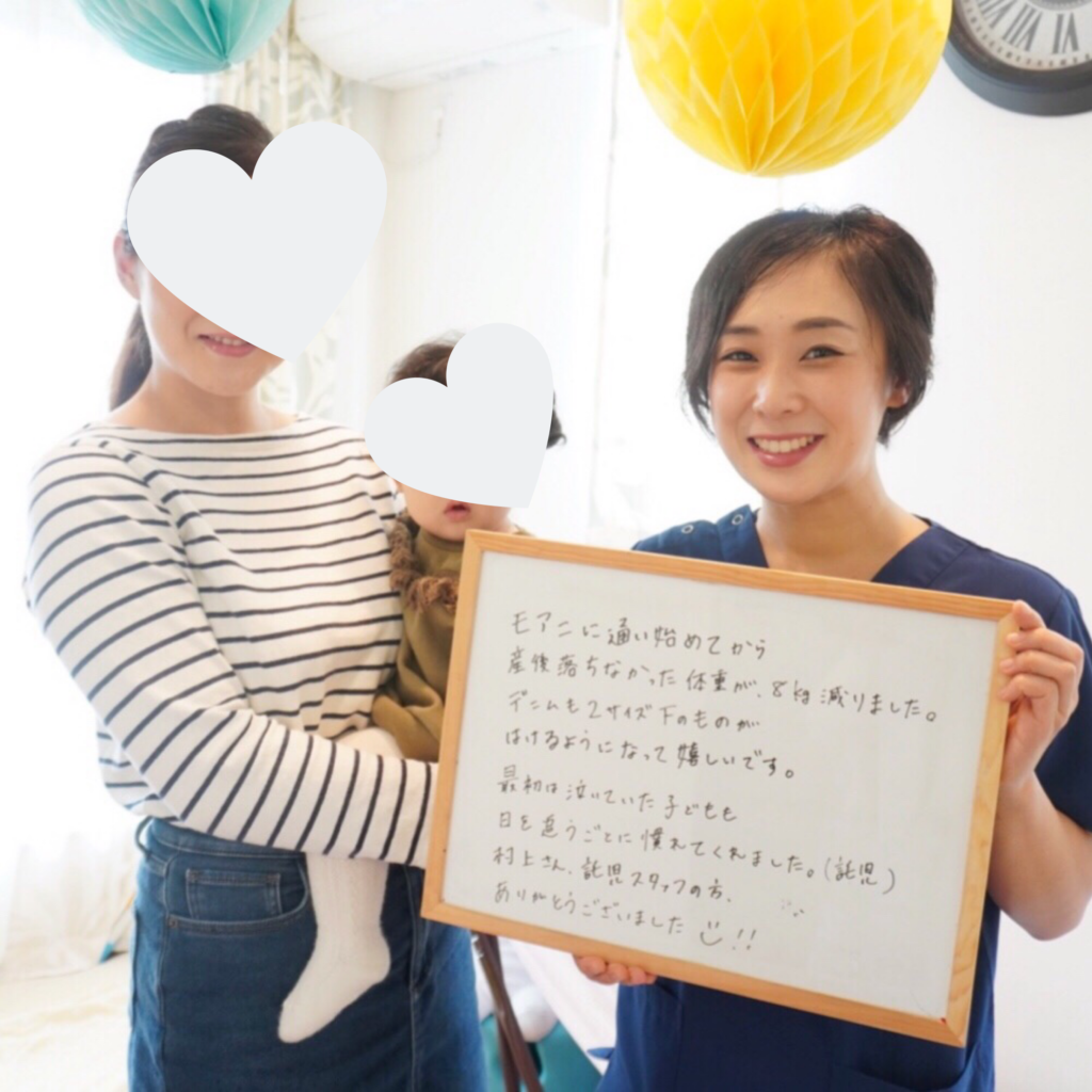 モアニの産後骨盤ダイエットコースを受けられたお客様から頂いた声と施術後の変化の分かる写真を掲載しております。