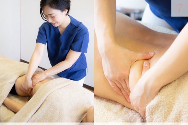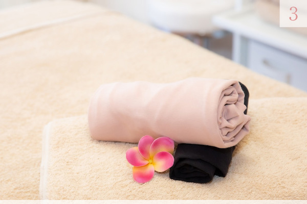 オイルマッサージでむくみを流し、脂肪を揉み出します。紙ショーツのみお履きいただきます。ベッドにはヒートマットを敷いております。室温は冬でも25~26度を保ち、寒くないよう調節しています。