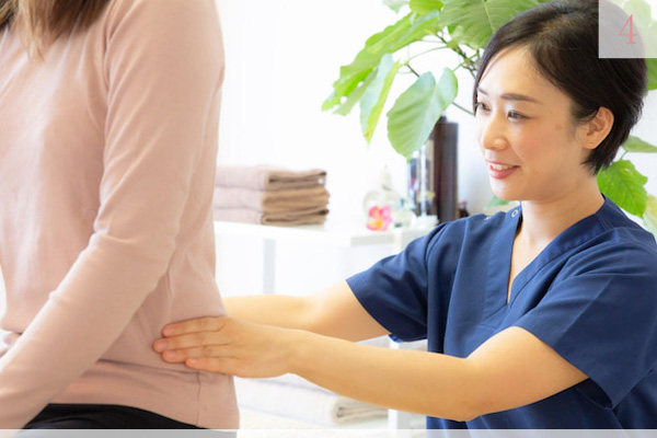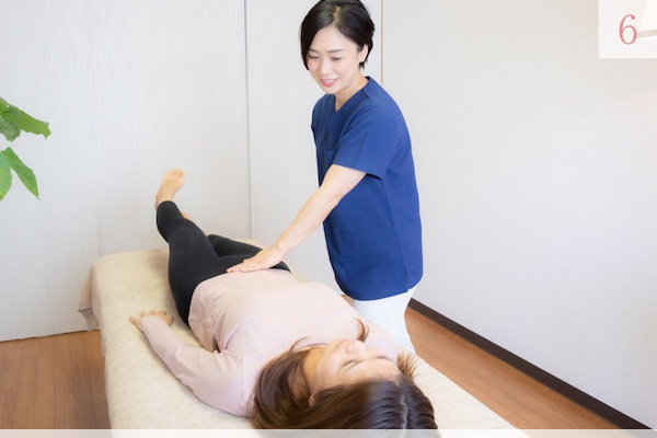 ⑤ベッドに横になっていただき、骨盤調整、ほぐし・ストレッチを行います。ベッドにはヒートマットを敷いております。室温は冬でも25~26度を保ち、寒くないよう調節しています。